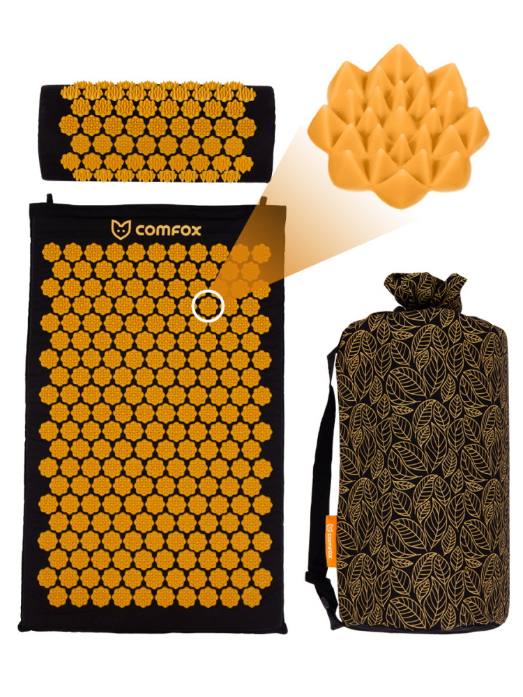 Массажный коврик размером 67*41 см с наполнителем из пены с эффектом памяти (memory foam) и съемным чехлом из 100% хлопка с 221 массажным цветком. В комплекте с ковриком идет массажный валик с 59 цветками под шею и хлопковая сумка для переноски.