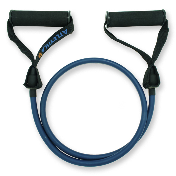 Синий эспандер с ручками имеет нагрузку 8,6 кг и длину 150 см. Растягивается в 3 раза, нагрузки будет достаточно для тренировок подготовленным женщинам и большинству мужчин.