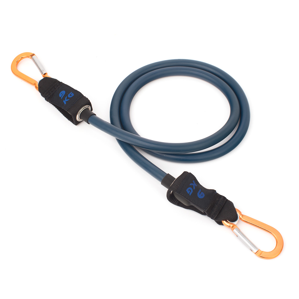 Синяя латексная трубка с внутренним противоразрывным кордом и двумя карабинами на концах имеет длину 120 см (с карабинами - 145 см), нагрузка 9 кг. Эспандер может растягивается в три раза от своей первоначальной длины (примерно до 360 - 380 см). К карабинам можно пристегнуть ручки или манжеты для ног.