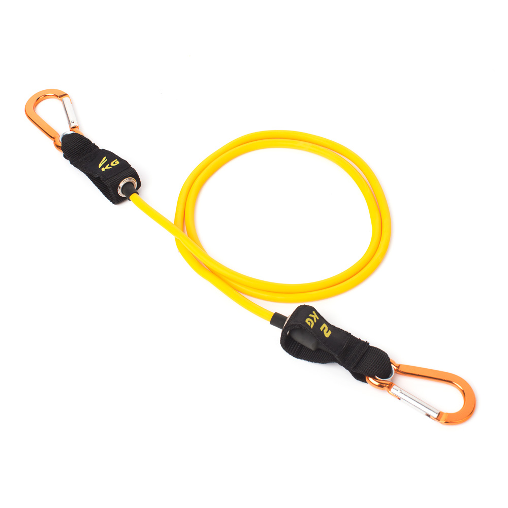 Желтая латексная трубка с внутренним противоразрывным кордом и двумя карабинами на концах имеет длину 120 см (с карабинами - 145 см), нагрузка 2 кг. Эспандер может растягиваться в три раза от своей первоначальной длины (примерно до 360 - 380 см).