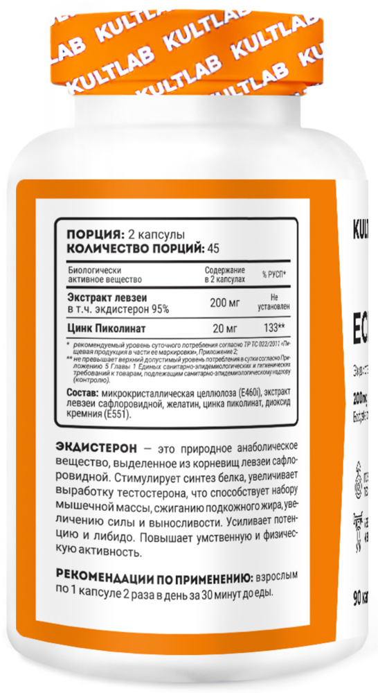 Kultlab Ecdysterone - усовершенствованная форма препарата, полученного из корневищ Левзеи Сафроловидной (Leuzea carthamodies), способствующая выработке тестостерона, увеличивающая рост мышечной массы, позволяющая повысить силу и выносливость.