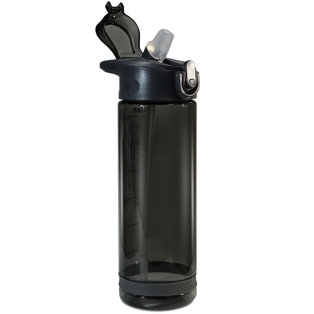 Цилиндрическая форма не только стильно выглядит, но и обладает максимальной вместимостью. Бутылку удобно держать в руке. Прочный корпус из пищевого пластика тритан не содержащего бисфенол А затонирован так, чтобы снаружи не было заметно, что находится в вашей бутылке, но при этом вы хорошо видите уровень жидкости. На корпус нанесена мерная шкала в мл и в унциях, чтобы было удобно следить за количеством жидкости. Бутылка имеет широкое горло и гладкие внутренние стенки, поэтому в нее легко наливать жидкость и очень просто мыть.