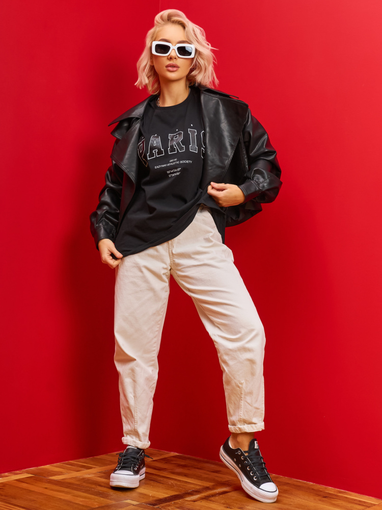 Трендовая футболка с умеренным оверсайз и стильным глянцевым принтом PARIS от дизайн-бюро EAZYWAY. Универсальная модель, которая подойдет как для спортивных, так и для повседневных образов – носите футболку с жакетами, бомберами, юбками или джинсами. Футболка отлично садится на любой тип фигуры. Мягкое хлопковое полотно премиум качества и эластичная печать безупречно сохраняют форму и цвет спустя множество стирок.