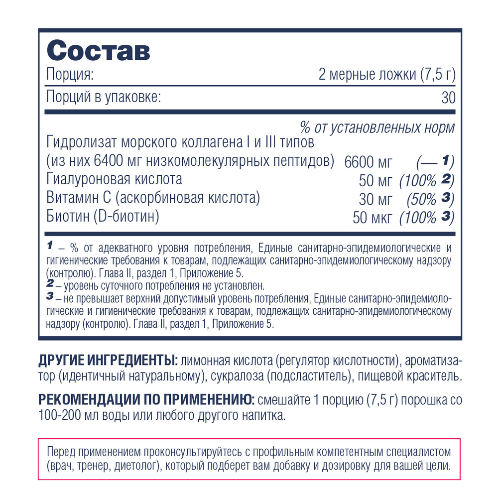 Гидролизат морского коллагена I и III типов (из них 6400 мг низкомолекулярных пептидов)	6600 мг