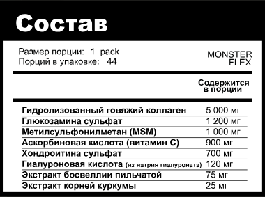 Monster flex - восстанавливает суставы и связки, оказывает укрепляющее действие, снимает воспаление и боль. Улучшает смазку суставов и смягчает стресс от поднятия тяжестей на тренировке. Предупреждает воспалительные реакции, стимулирует синтез клеток соединительной ткани связок, тем самым способствуя скорейшему восстановлению после нагрузок и трав.
