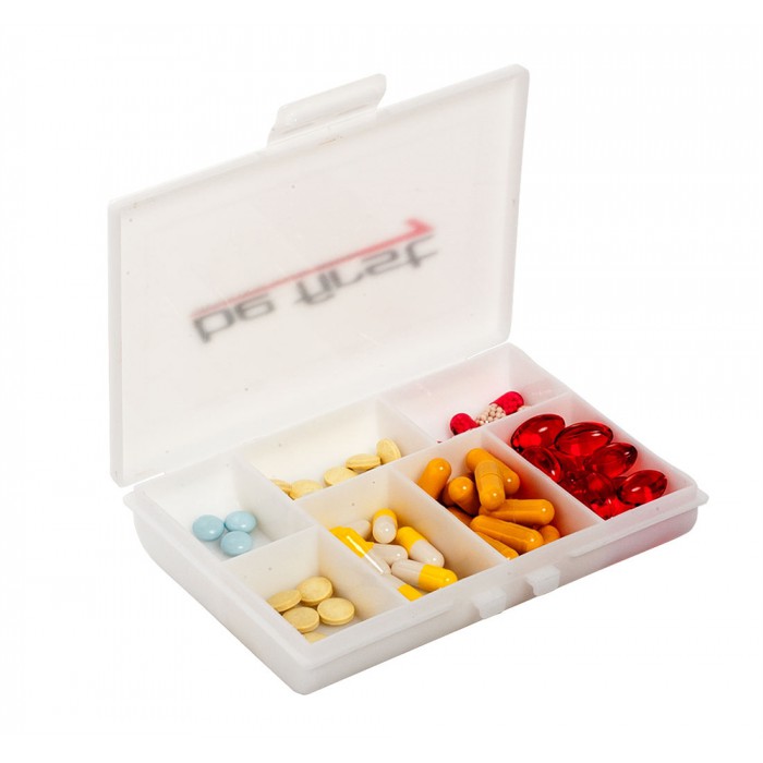 Таблетница компании Be First является очень удобным аксессуаром для всех, кто принимает различные препараты — витамины, лекарства, капсулированные добавки и т.п. В таблетнице их удобно взять с собой на тренировку или в поездку, зная, что ничего не рассыплется, не потеряется и не перепутается. Все таблетницы делаются из экологичного пищевого пластика BPA & DEHP FREE. Данная таблетница имеет внутри 7 отделений — можно взять 7 препаратов, или разделить один на 7 приемов, к примеру, по дням недели. Имеются черные, белые и прозрачные таблетницы. Крышка закрывается плотно и язычок удерживается двумя выступами, что исключает случайное открывание.