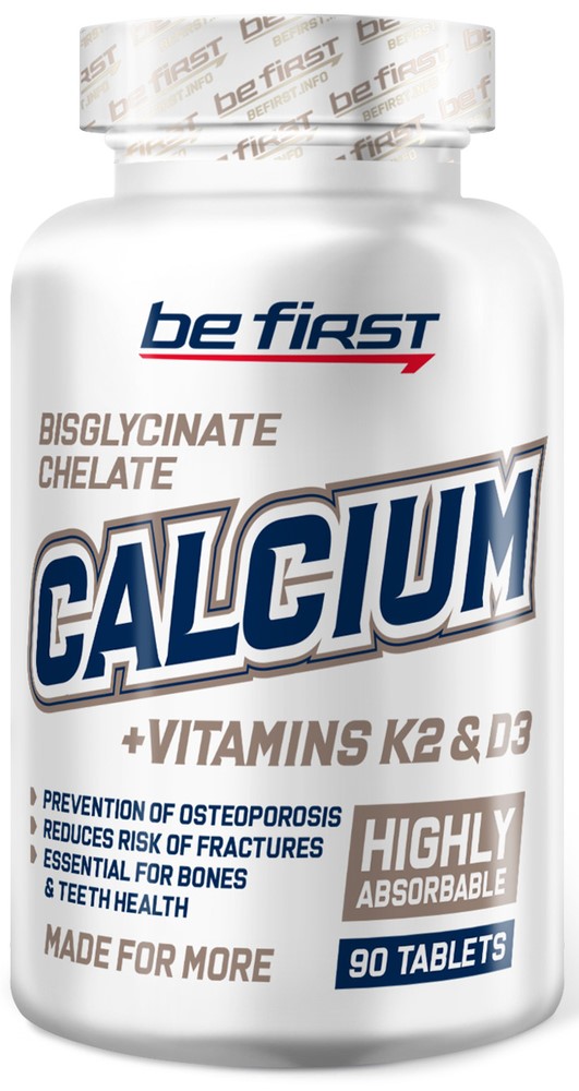 Calcium bisglycinate chelate + K2 + D3 от Be First – это легкоусваивающаяся добавка для здоровья костей и сердечно-сосудистой системы. Она помогает поддерживать в хорошем состоянии зубы и кости, снижает риск переломов, защищает сосуды, снижая опасность инсульта и инфаркта.