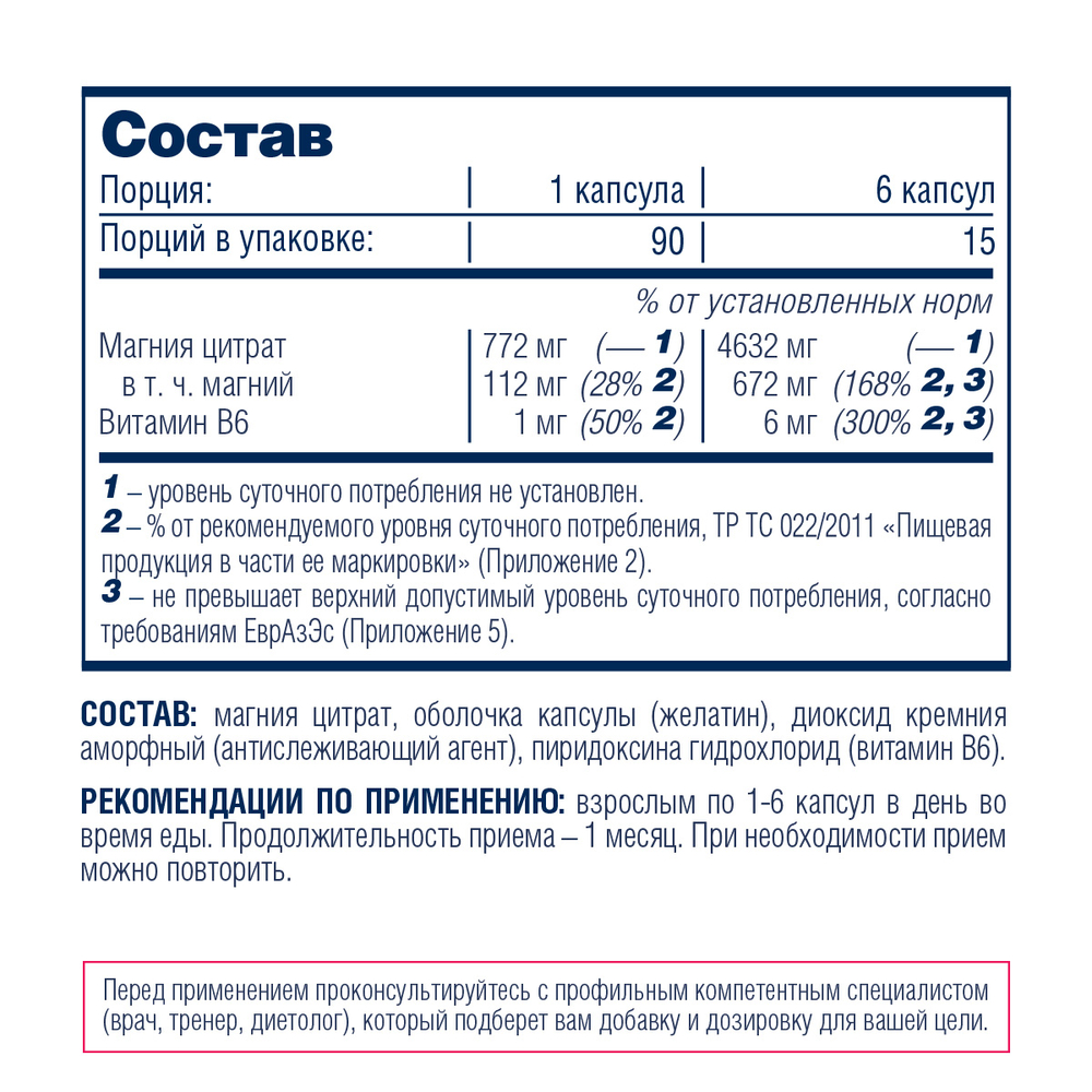 Сочетание магния в форме цитрата (органической соли с высокой биодоступностью) и витамина B6 (пиридоксина) восполняет потребности организма в этих веществах. [3] Витамин B6 важен и сам по себе, но он также участвует в усвоении магния. [2]