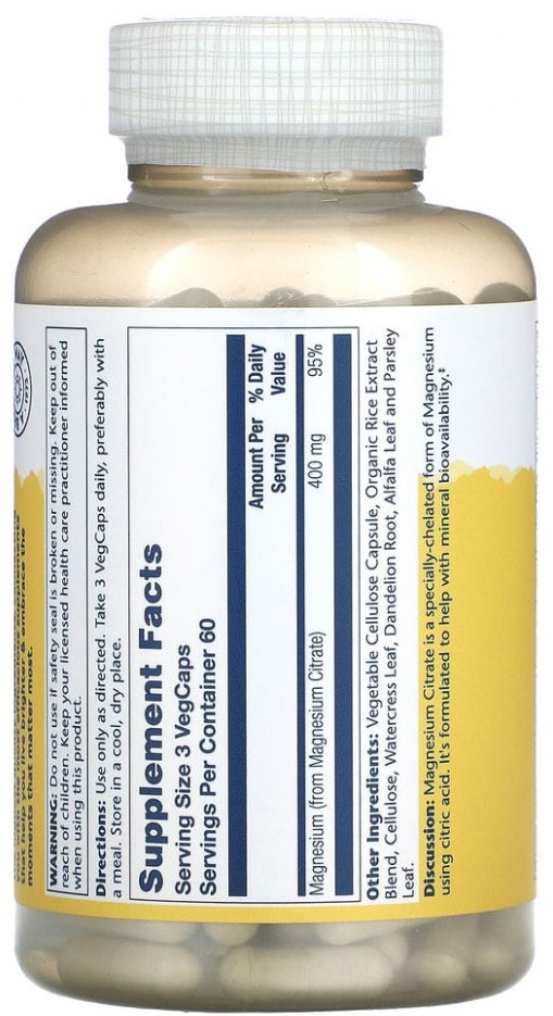 Цитрат магния — особая форма магния, хелатированная с использованием лимонной кислоты. Минералы, связанные с лимонной кислотой, специально разрабатываются для людей с низким содержанием желудочной кислоты и предназначены для улучшения минеральной биодоступности. Магний участвует в многочисленных ферментативных реакциях в организме и предназначен для обеспечения питательной поддержки нормальной, здоровой работы сердца, мышц, нервов и кровообращения.