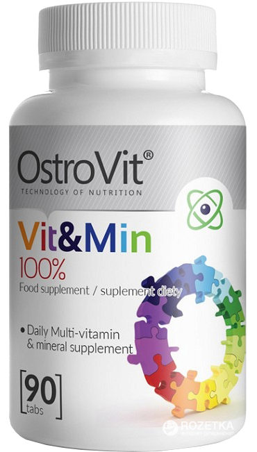 OstroVit 100% VIT & MIN это комплекс витаминов и минералов. Наша формула имеет состав, который удовлетворяет потребности организма взрослого человека. Продукт рекомендуется для людей, живущих активно, особенно спортивных людей.