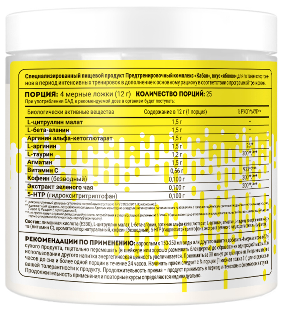 Самый мощный предтренировочный комплекс с неземной силой Кабана. Предназначен только для хардкорных пользователей, которые почувствуют, как Кабан приступает к работе после первой же дозы.