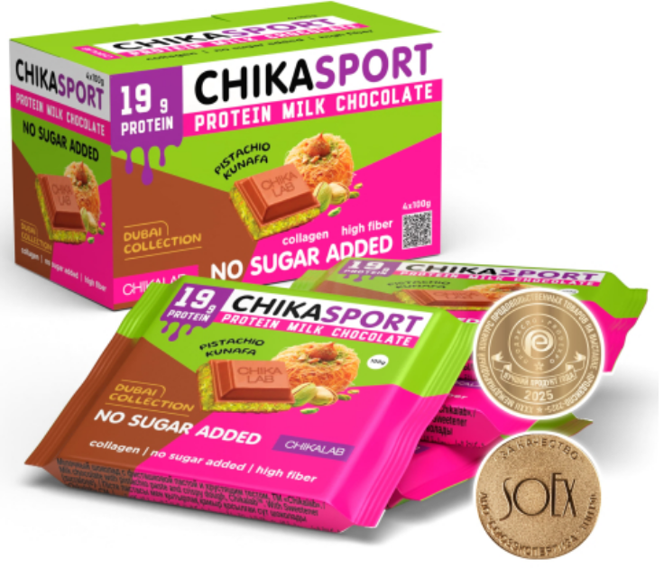 CHIKASPORT DUBAI COLLECTION - протеиновый десерт, вдохновленный легендарным Дубайским шоколадом. Нежнейший молочный шоколад с начинкой из фисташковой пасты и хрустящего теста катаифи, доставленного прямиком из Дубая, не оставит равнодушным никого.