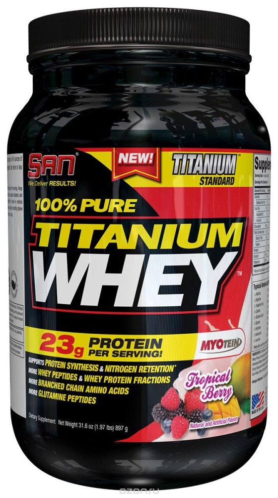 SAN 100% Pure Titanium Whey наиболее быстродействующий, легко усваиваемый протеин среди аналогов, гарантированно сохраняющий и быстро увеличивающий мышечную массу.