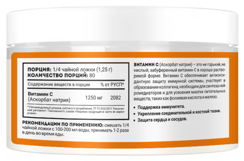 Аскорбат натрия (Витамин С) - это не горький, не кислый, забуференный витамин С в хорошо растворимой форме. Он необходим ждя производства коллагена(структурного белка, необходимого для здоровья соединительных тканей) и поэтому важен для здоровья кожи, костей и суставов. Он также необходим для метаболизма аминокислот, синтеза нейромедиаторов и усвоения многих питательных веществ, таких как фолиевая кислота и железо.
