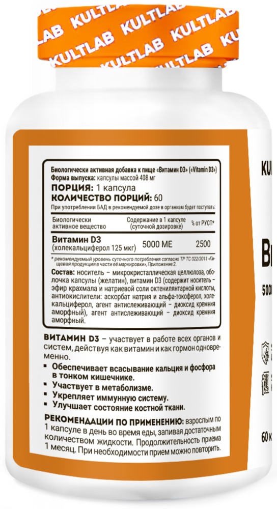 Витамин D3 от KultLab уникален - он одновременно действует и как витамин, и как гормон. Как витамин он поддерживает уровень фосфора и кальция в плазме крови и повышает всасывание кальция в тонкой кишке.