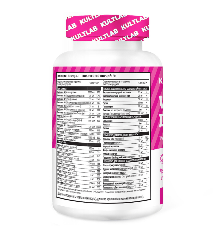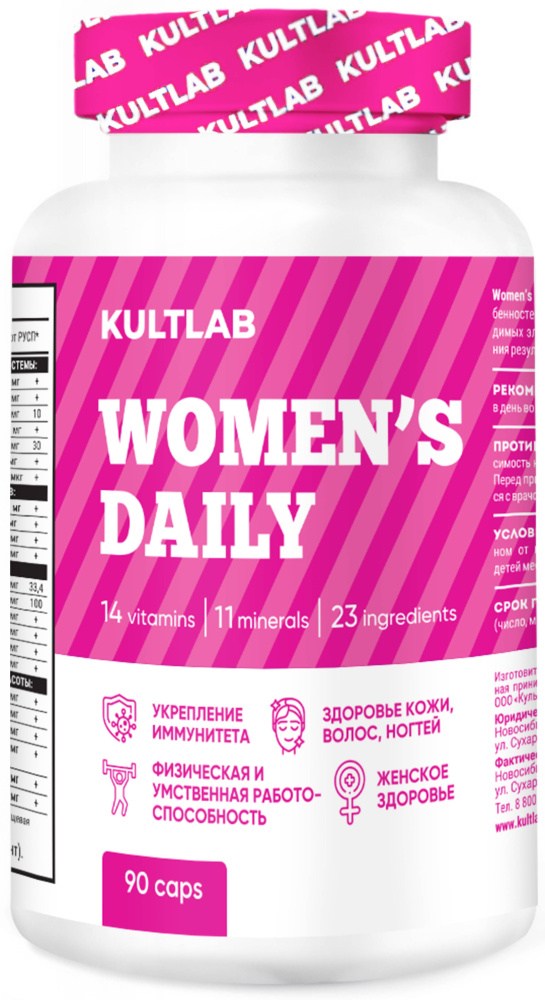Women's daily - комплекс витаминов и минералов разработан с учетом особенностей обмена веществ и потребностей женского организма. 48 необходимых элементов обеспечат спортсменок всем необходимым для улучшения результатов физических тренировок.