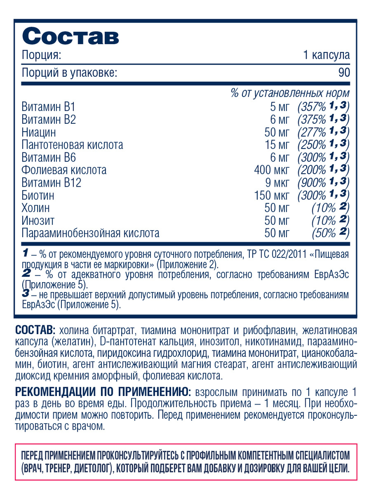 Состав: холина битартрат, тиамина мононитрат и рибофлавин, желатиновая капсула (желатин), D-пантотенат кальция, инозитол, никотинамид, парааминобензойная кислота, пиридоксина гидрохлорид, тиамина мононитрат, цианокобаламин, биотин, агент антислеживающий магния стеарат, агент антислеживающий диоксид кремния аморфный, фолиевая кислота.