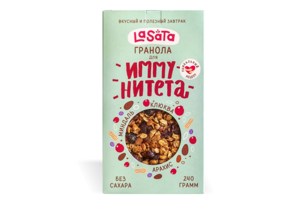 Хрустящая гранола с миндалем, арахисом, вяленой клюквой, изюмом, корицей и мёдом. Звездный вкус для самых-самых!